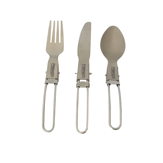 Le set de couvert Frendo est composé d'une fourchette, d'un couteau et d'une cuillère avec le manche en acier inoxydable et l'outil en titane. Il est vendu dans une housse, ainsi, rangé il ne prend pas de place et pourra vous suivre en trek, randonnée ou même en voyage.